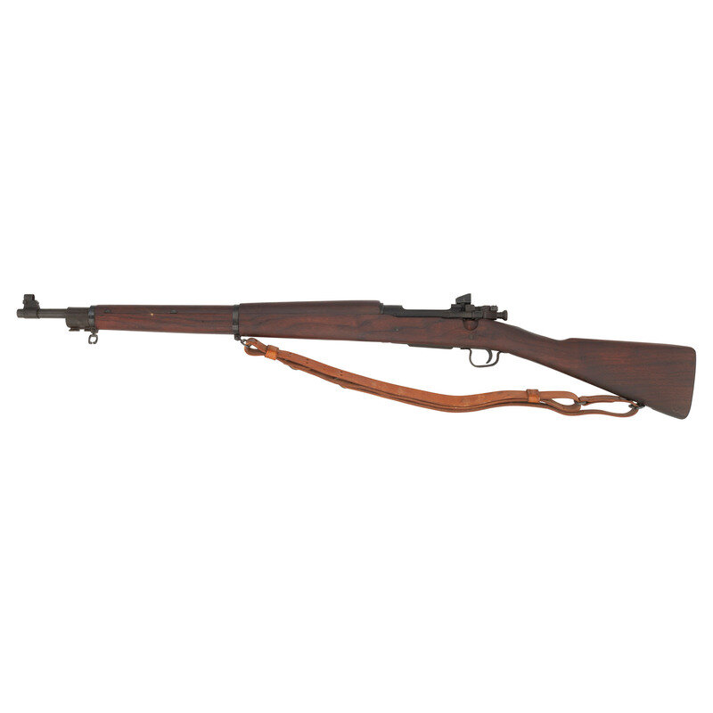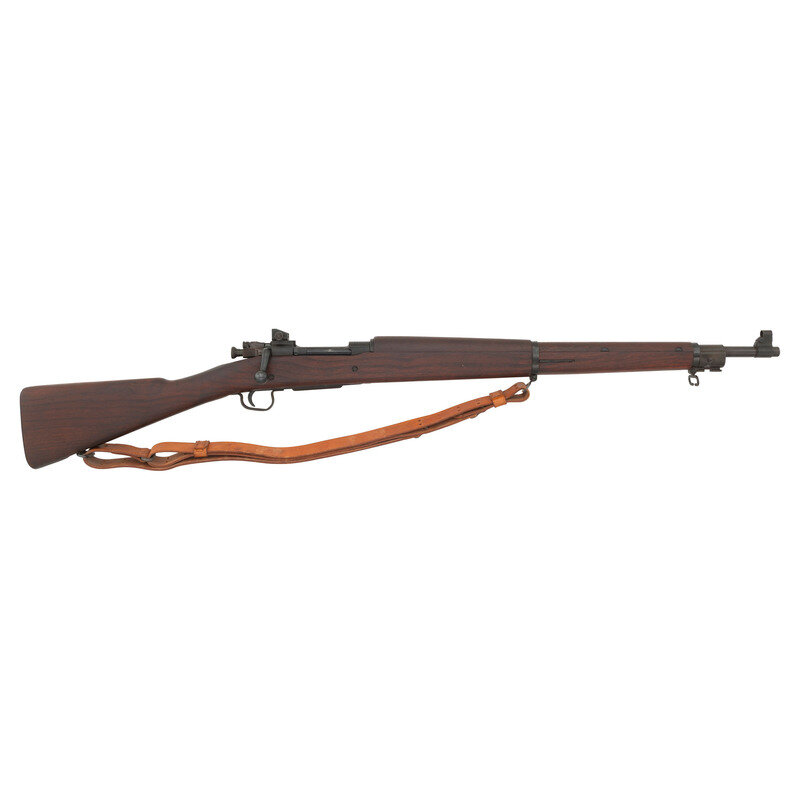 .30-06. 24" barrel length. SN: 4839654. Parkerized metal arsenal refinish with stamped small parts set in walnut straight wrist stock and mounting adjustable aperture rear notch and pinned front blade with hood. Bolt action internal magazine fed repeating rifle charged with stripper clips. Item shows standard U.S./SMITH-CORONA/MODEL 03-A3 model mark to receiver and S C/{Ordnance Bomb}/11 43, the latter indicating the barrel was made by Smith Corona in November, 1943. P mark struck into the forward barrel with circle P to the wrist. Left wrist is struck with the US Ordnance {Crossed Cannons} mark beside the boxed FJA cartouche of arms inspector Frank J. Atwood. Further marks include OG to left butt, indicating it was rebuilt by Ogden Arsenal, R to the sight hood, and four numerical stamps to forend near magazine well. Markings include: 8 in triangle, 4 in circle, 4 in square, and 6 in diamond. Item mounts a flat checkered trapdoor buttplate, and a Pattern 1905 style sling.