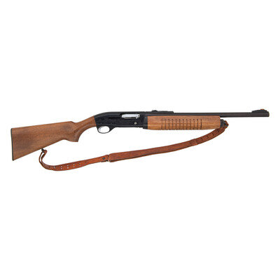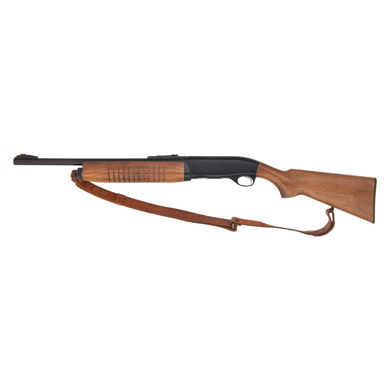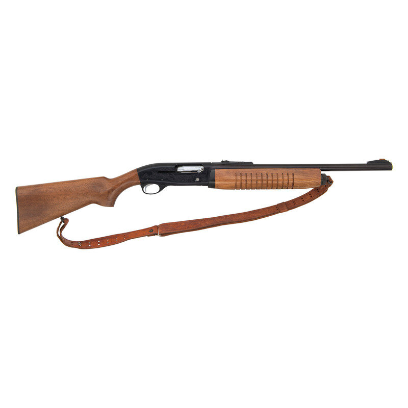 12 Gauge. 20" barrel length. SN: S1348974. 2.75" barrel length. Cylinder Bore. Blued metal finish with polished bolt, black Anodized alloy frame, and set in a walnut semi-pistol grip stock with ribbed forend. Gas operated semi-automatic shotgun fed by an internal tube magazine and mounting adjustable rear notch and red synthetic front blade sights. Receiver is engraved with floral scroll embellishments to receiver flanks. Standard make and model markings overall. Item mounts a leather sling.