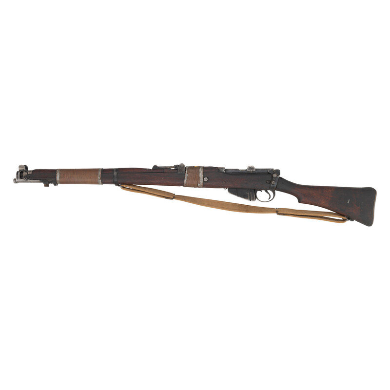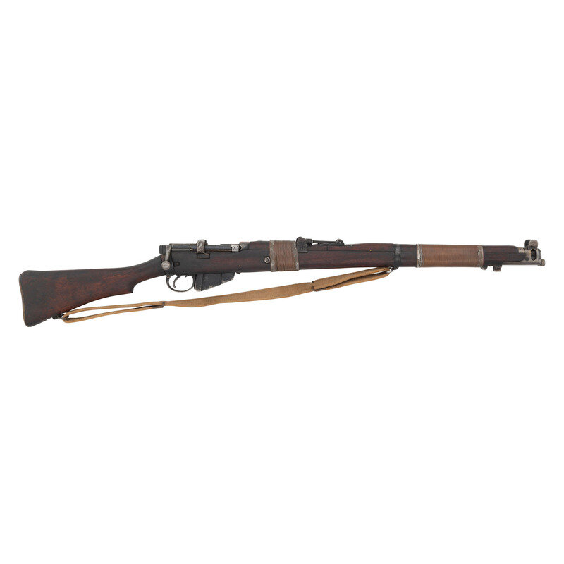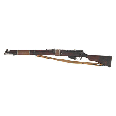 .303 British. 25.2" barrel length. SN: I24442. Suncorite finish overall set in walnut semi-pistol grip stock with full length upper handguard and mounting copper wire bands lead soldered into place. Bolt action internal magazine fed repeating rifle mounting adjustable tangent rear notch and front blade sights with protectors. Right stock ring struck {Crown/G.R.I./1944/No1MKIII*}. The rifle shows scattered crossed flags proof markings, and additional proofs. Serial numbers match on the bolt handle and receiver. Item mounts a khaki canvas sling.
