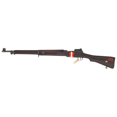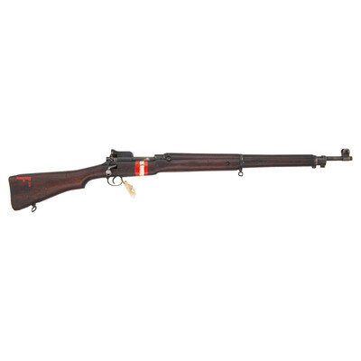 .303 British. 26" barrel length. SN: RF09005. Blued metal finish with walnut semi-pistol grip stock, full length upper handguard, and mounting adjustable ladder rear aperture and front blade sights with protectors. Bolt action internal magazine fed repeating rifle charged with stripper clips. Item shows {Crossed Flags} markings and British military proofs scattered over major parts. The receiver, triggerguard, bolt, right butt, and upper handguard are all struck DP for "Drill Purpose", indicating the rifle was condemned in some way and deemed fit only for drilling. Item painted with twin red bands enclosing a singular white one, F to right butt, B to left, and a rack number of 63. Serial numbers match on the receiver and bolt. A hole has been drilled through the chamber and a rod hammered in place, thereby rendering the rifle unable to fire.