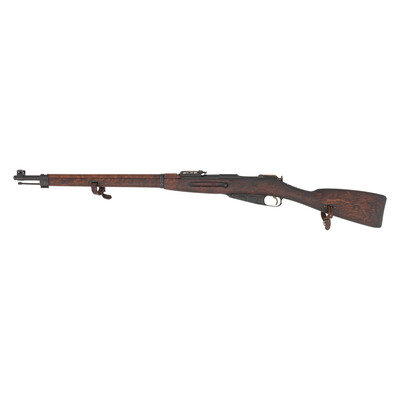 7.62x53mmR. 27" barrel length. SN: o11974. Blued military finish with polished steel bolt. Spliced hardwood stock with straight grip, grasping grooves, and handguard. Bolt action rifle with adjustable folding notch M91 rear sight and blade front sight with ear protectors. Item features a hex receiver, integrated magazine, bayonet lug forend, leather dog collar sling loops, and cleaning rod. Markings include SY SIG M28 markings to receiver, various Soviet serial numbers/proofs, and obscured cartouche to left of butt.