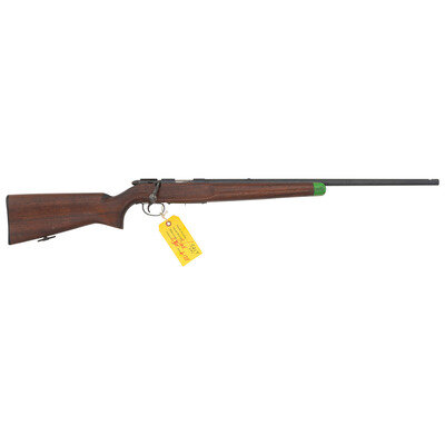 .22 S/L/LR. 23" barrel length. SN: 3607. Blued metal finish with polished bolt mounting walnut semi-pistol grip bench style stock with hand stop mounting plate to forend with seven mounting ports. Bolt action detachable magazine fed repeating rifle with dovetail cut receiver, and mounting a rear sight mounting block for peep sight. Barrel shows standard two-line address and patent mark followed by underlined Remington marking and MODEL 521-T/.22 SHORT, LONG, OR LONG RIFLE. Bolt is engraved with serial number 72918. Nosecap is painted neon green and engraved with rack number T-1. Item lacks iron sights, and magazine.