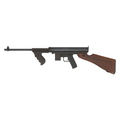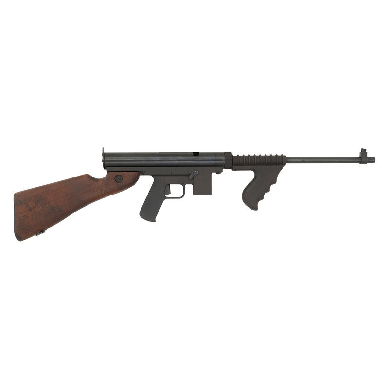 .45 ACP. 16.5" barrel. SN: 26018. Blued and Parkerized finish, walnut buttstock, metal vertical grip and pistol grip. Semi-automatic magazine fed carbine that vaguely resembles a Thompson sub-machine gun, firing from an open bolt with fixed sights. Eagle Gun Co markings. No magazine is present.