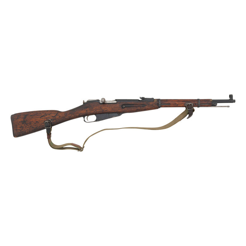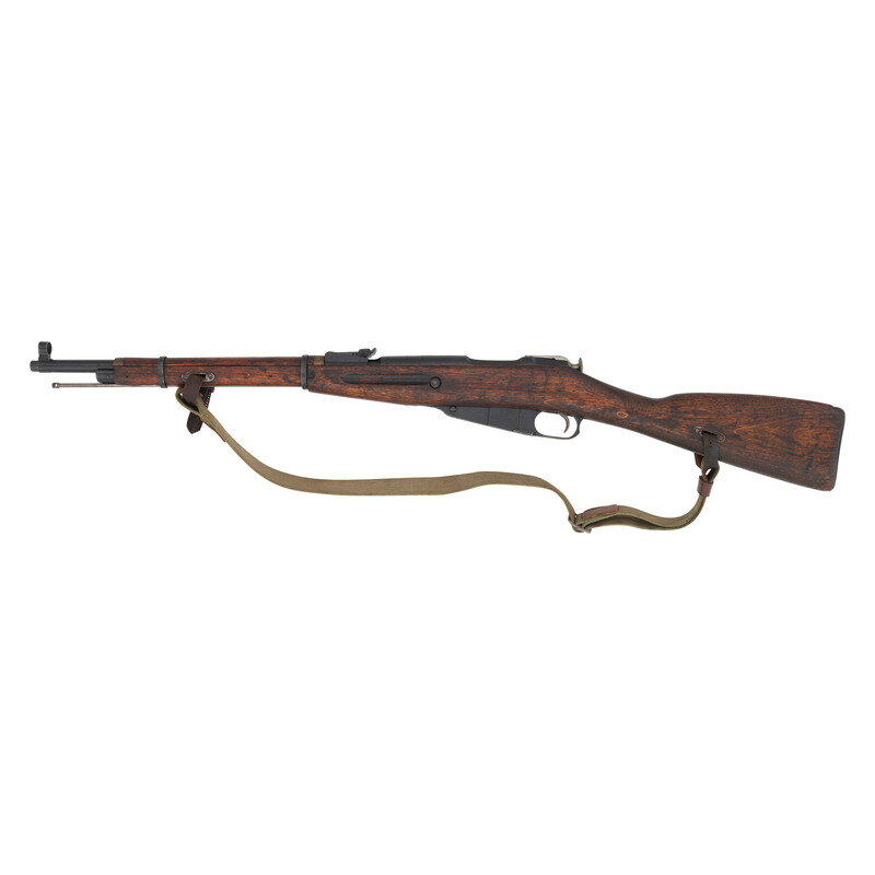 7.62x54mmR. 20.2" barrel length. SN: ZhT2720 (Cyrillic). Arsenal reblued metal finish with polished bolt set in straight wrist birchwood stock with adjustable tangent rear notch and post and globe front sights. Bolt action internal magazine fed repeating rifle with full length upper handguard. Rear sight is calibrated from 100 to 1000 meters. Barrel shank shows Soviet {Sickle and Hammer} acceptance mark above a date of 1941. Barrel shank additionally shows the {Arrow in Triangle} marking of the Izhevsk arsenal. Finnish boxed SA capture mark to the left side of the barrel shank. Serial numbers of barrel shank and bolt match with magazine floorplate number ground off. Comes with a Soviet pattern dog collar canvas sling.