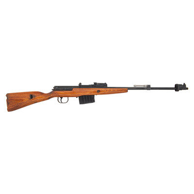7.92x57mm. 21.5" barrel length. SN: 7865o. Black painted finish over phosphate set in sanded laminated wood stock mounting adjustable tangent rear notch and front blade sights. Incomplete short-stroke gas piston driven semi-automatic rifle fed by semi detachable double stack magazines. Forward receiver is struck G. 43 duv 44 followed by {Eagle/274} waffenamt and WWII German Eagle acceptance proof. The duv mark indicates this rifle was made in Berlin by Luebeck. Rifle is missing the buttplate, muzzle nut, cleaning rod, actuator rod, actuator rod spring, connecting rod, gas cylinder, dustcover, and upper handguard. The handguard has been cut down. Stock sanded to an excessively thin wrist. Bolt housing is cracked. Trigger is missing internal plate, leaving trigger components exposed.