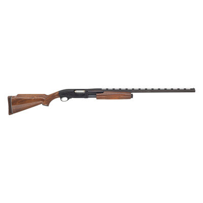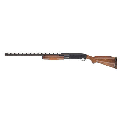 12 gauge. 30" barrel length. SN: S9000566. Blued metal finish to barrel, with parkerized finish to frame. Two piece walnut stock has checkering to semi pistol grip and forearm, with raised comb. Slide action shotgun with a matted vent rib, steel bead mid-sight, and a white bead front sight. Item features a tube magazine, scroll engravings to frame, and vented rubber recoil pad.