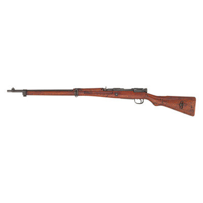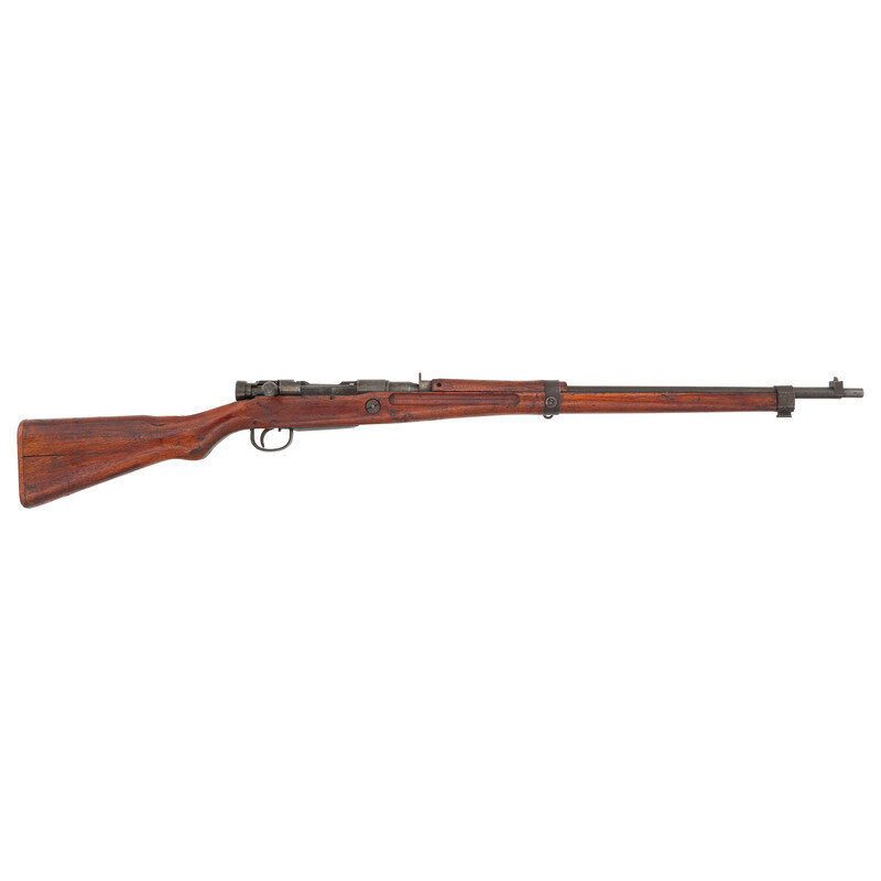 7.7x58mm Arisaka. 26" barrel length. SN: 67867. Blued military finish. Hardwood semi pistol grip stock and forearm, with handguard and grasping grooves. Bolt action rifle with fixed peep rear sight and blade front sight. Item features an internal box magazine, double side mount sling swivels, bayonet lug forend, and a wood buttplate.