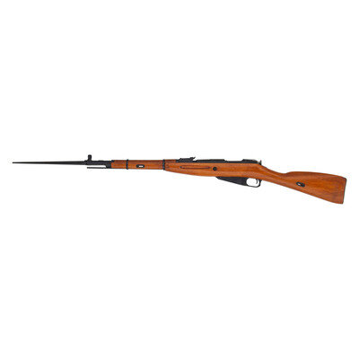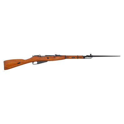 7.62x54mmR. 20.2" barrel length. SN: 1397073. Blued metal finish with polished bolt set in straight wrist boxwood stock with full length upper handguard mounting sidefolding cruciform spike bayonet. Bolt action internal magazine fed repeating rifle mounting adjustable tangent rear notch with post and globe front sights. Barrel shank struck with Chinese factory 296 marking followed by Chinese type markings, and date of 1955.3. Serial numbers match on barrel, bolt, and magazine floorplate. Importer mark to right receiver reads N.A. CO./RIDGEFIELD N.J.