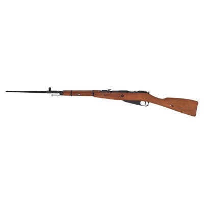 7.62x54mmR. 20.2" barrel length. SN: AV7530 (Cyrillic). Blued metal finish with polished bolt mounting straight wrist Birchwood stock with full length upper handguard mounting sidefolding cruciform spike bayonet. Bolt-action internal magazine fed repeating rifle mounting adjustable tangent rear notch and post and globe front sights. Barrel shank is marked with Soviet {Sickle and Hammer} acceptance proof and {Arrow in Triangle} marking of the Izhevsk Arsenal in addition to a date of 1944. Serial numbers match on the barrel shank, magazine floorplate, bolt, and left butt.
