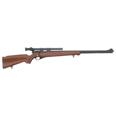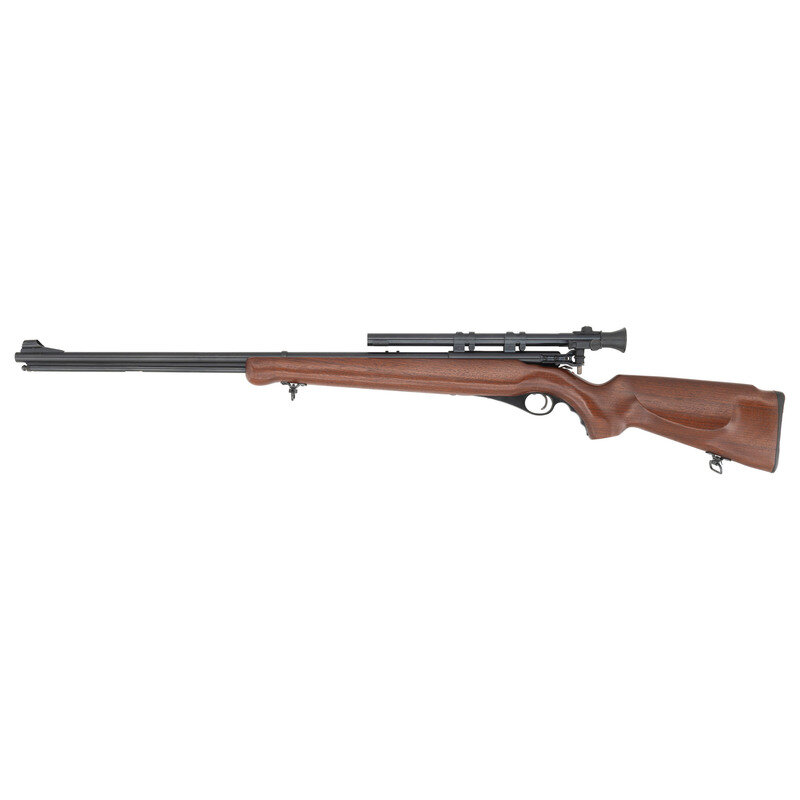 .22 LR. 26" barrel length. SN: NSN. Blued metal finish. Walnut semi pistol grip stock with cheek rest. Bolt action rifle with scope, adjustable swivel peep rear sight, and hooded post front sight that is interchangeable. Item features double sling swivels and a full tube magazine.