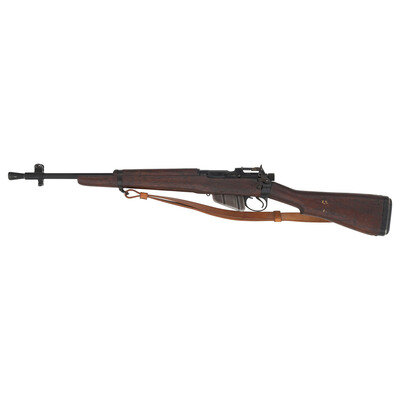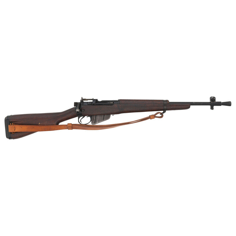 .303 British. 20.5" barrel length. SN: P3465. Black Suncorite finish. Walnut semi pistol grip stock with handguard. Bolt action rifle with an adjustable folding peep rear sight and blade front sight with ear protectors. Item features a removable magazine, double sling swivels, cupped rubber recoil pad, flash suppressor, bayonet lug, and brown leather sling. Markings include R.O.F. manufacturer marks, a 7/45 date, and a few broad arrow proofs. Stock has obscured painted markings to butt.
