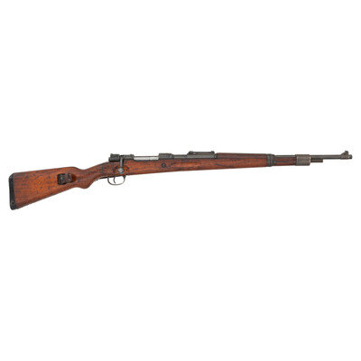 .308. 23.62" barrel length. SN: 8324a. Blued metal refinish, walnut semi pistol grip stock, half length upper handguard, and mounting adjustable tangent rear notch and front blade sights. Bolt action internal magazine fed repeating rifle charged with stripper clips. Item features finger grooves, and late pattern bolt disassembly port in lower buttplate. Receiver shows S/243 manufacturer code for Mauser-Werke over a date of 1938. German {Eagle} stamp to left receiver and three {Eagle/280} waffenamt marks to the right. Receiver and toe of stock show 7.62 caliber markings applied after its conversion by Israel with further Hebrew markings applied to left receiver along with Israeli {Star of David} stamp. Sling is leather and shows a Hebrew letter code followed by 2804-02524.