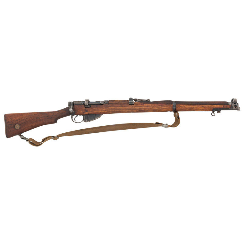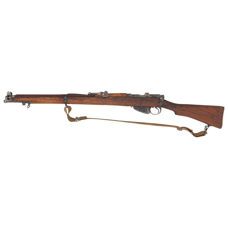 .303 British. 25.2" barrel length. SN: L23617. Blued metal finish with walnut semi-pistol grip stock, two piece full length upper handguard, brass buttplate, and adjustable tangent rear notch and front blade sights with protectors. Bolt action semi detachable magazine fed repeating rifle charged with stripper clips. Right side of stock ring shows manufacture marking {Crown/GR/B.S.A. CO./1936/SHT LE/III*}. Item shows scattered British military proofs to major parts. Forward receiver and rear barrel struck with Iraqi {Triangle 2} marking with Arabic numerals struck into the rear bolt. Brass disc to the right butt is unmarked. Comes with a khaki colored nylon sling.