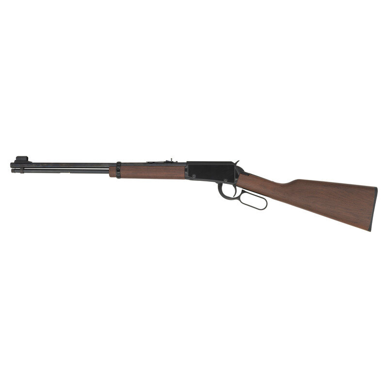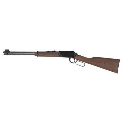 .22 S/L/LR. 18.5" barrel length. SN: 1114947H. Blued metal finish with black enamel receiver set in walnut straight wrist stock with black synthetic buttplate. Lever action repeating rifle fed by a full length frontally loaded tube magazine mounting adjustable flat top rear notch and fully hooded front blade sights. Item features standard make and model markings. Comes in its original cardboard box with the hanging tags and owner's manual.