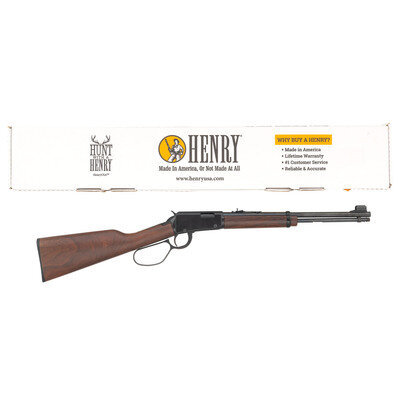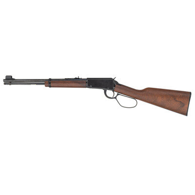 .22 S/L/LR. 16.25" barrel length. SN: C073358H. Blued finish with black enamel receiver in walnut straight wrist stock with black synthetic buttplate. Lever action repeating rifle fed by a full length frontally charged magazine tube and mounting adjustable flat top rear notch and hooded front blade sights. Rifle features a large lever loop. Standard make and model markings overall. Comes in its original cardboard box with the owner's manual and hanging tags.