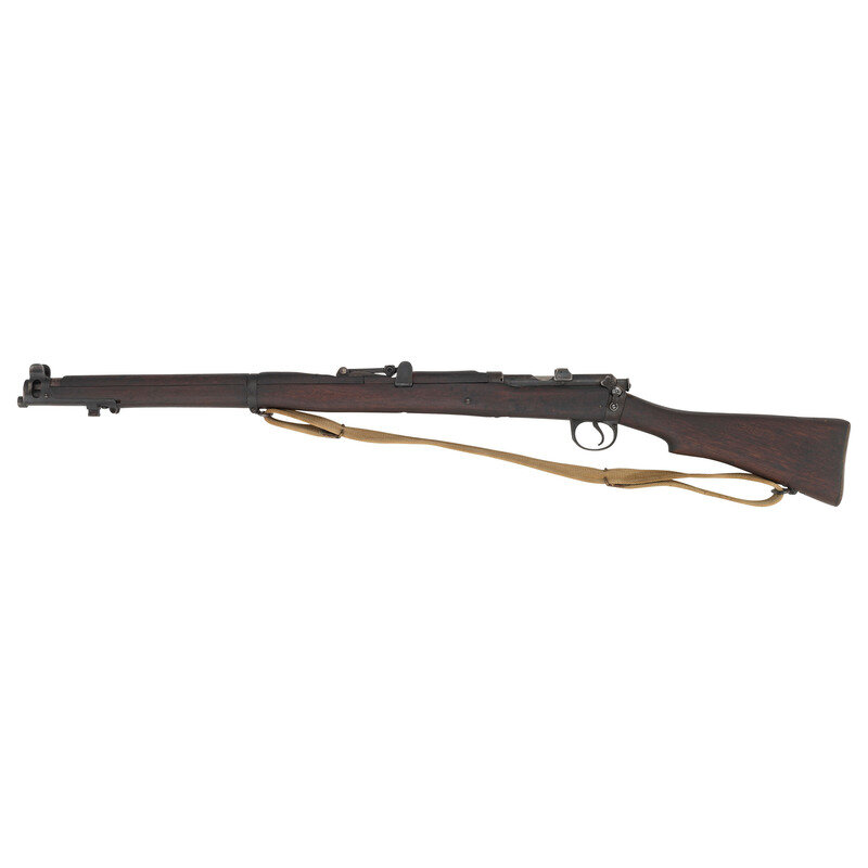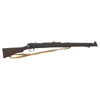 .410 Gauge. 25.2" barrel length. SN: 7731. Blued metal refinish set in walnut semi pistol grip stock with full length two-piece upper handguard mounting brass buttplate. Bolt action single-shot riot shotgun mounting adjustable tangent rear notch and front blade sights with protectors. Right stock ring is struck with maker marking reading {Crown/GR/ENFIELD/1912/SHTLE/III}. Item shows scattered British military proof markings.