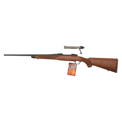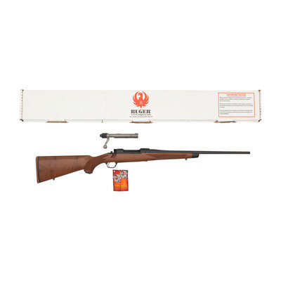 .257 Roberts. 20" barrel length. SN: 711-29568. Matte blued metal finish with matte stainless bolt set in walnut semi pistol grip stock with rubber recoil pad and black synthetic nosecap. Bolt action internal magazine fed repeating rifle with the receiver cut for mounting Ruger pattern scope rings. Item shows standard make and model markings. Comes in its original cardboard box with two one-inch scope rings, the owner's manual, and an Allen key in its package.