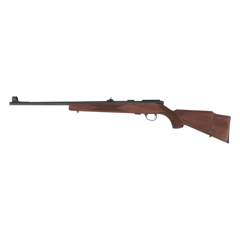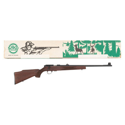 .22 LR. 22.5" barrel length. SN: 706358. Blued metal finish with matte bolt set in walnut Monte-Carlo style stock with front and rear sling swivel studs and checkering to wrist and forend. Bolt action detachable magazine fed repeating rifle mounting adjustable WILLIAMS rear notch and fully hooded front blade sights. Item further features dovetail cut to receiver for optics mounting. Standard make and model markings including MADE IN FINLAND to left barrel. Item comes in its original cardboard box.