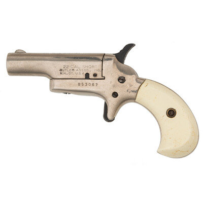 .22 Short. 2.5" barrel length. SN: B53067. Nickel plated finish with matte blued hammer and trigger mounting synthetic ivory grips. Rotating breech derringer with single action hammer and spur trigger. Top of the barrel struck -BUTLER- with left barrel marked 22 CAL. SHORT/BUTLER ASSOC., INC./N.H., CT. U.S.A.