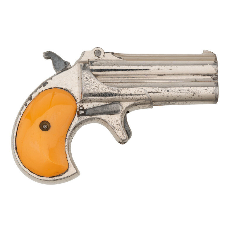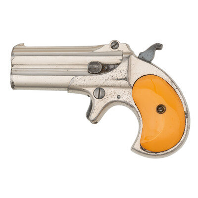 .41 RF. 3" barrels. SN: 89. (Mfc ca 1904-1910) Nickel plated refinish with blued small parts mounting smooth imitation ivory grips and standard fixed font blade and rear notch sights. Single action two-barrel derringer with manually actuated extractor. Item features a spur trigger and birdshead grips. Barrel rib is marked REMINGTON ARMS--U.M.C. CO. ILION, N.Y.