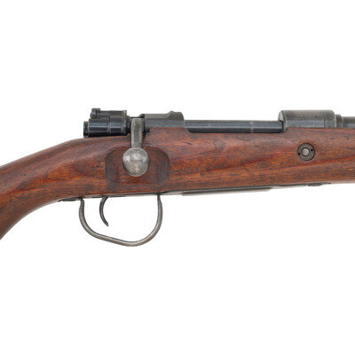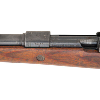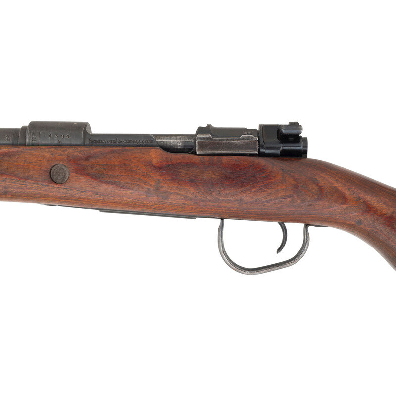 7.92x57mm. 23.23" barrel length. SN: 4304N. Blued metal finish set in laminated wood semi-pistol grip stock with half length upper handguard. Bolt action internal magazine fed repeating rifle with adjustable tangent rear notch and inverted-V front blade sight with detachable front sight hood. Left receiver struck with the manufacturer marking CESKOSLOVENSKA ZBROJOVKA, A.S., BRNO. Barrel and receiver struck with the Czech {Lion} stamp. Rifle mounts stamped stock fittings and triggerguard. Importer marks to forward barrel. Serial number to bolt matches receiver. Comes with cleaning rod.