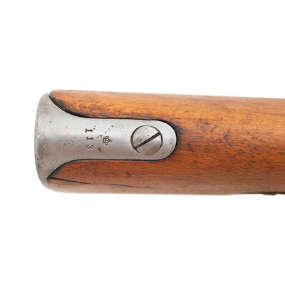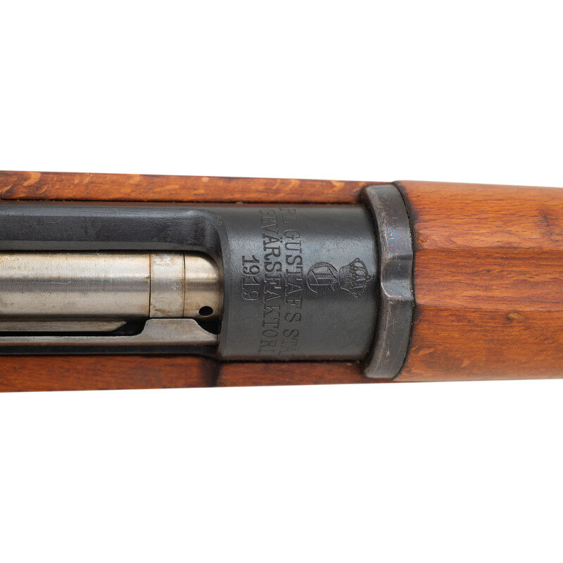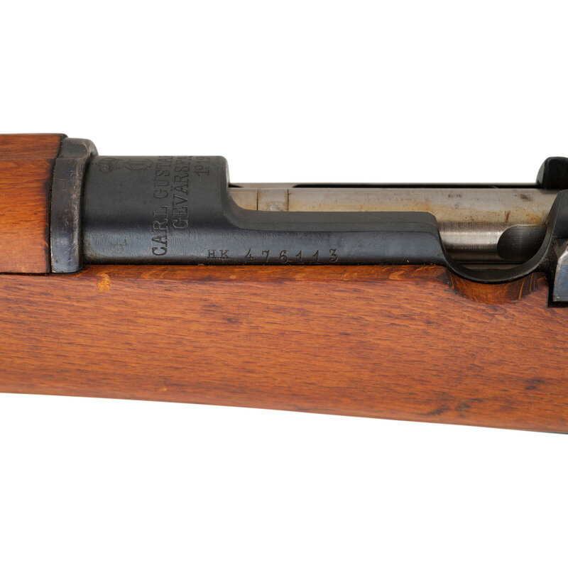 6.5x55mm Swedish. 29.5" barrel length. SN: 476113. Blued metal finish. Straight grip walnut stock with grasping grooves and handguard. Bolt action rifle with an adjustable folding ladder rear sight and blade front sight. Item features an internal magazine, double sling swivels, threaded muzzle, and bayonet lug forend. Markings include Carl Gustafs marks and a 1919 date to receiver, as well as import marks to right of barrel. Includes a brown leather sling.