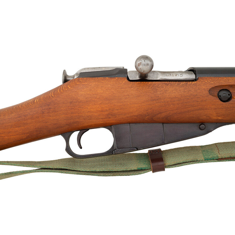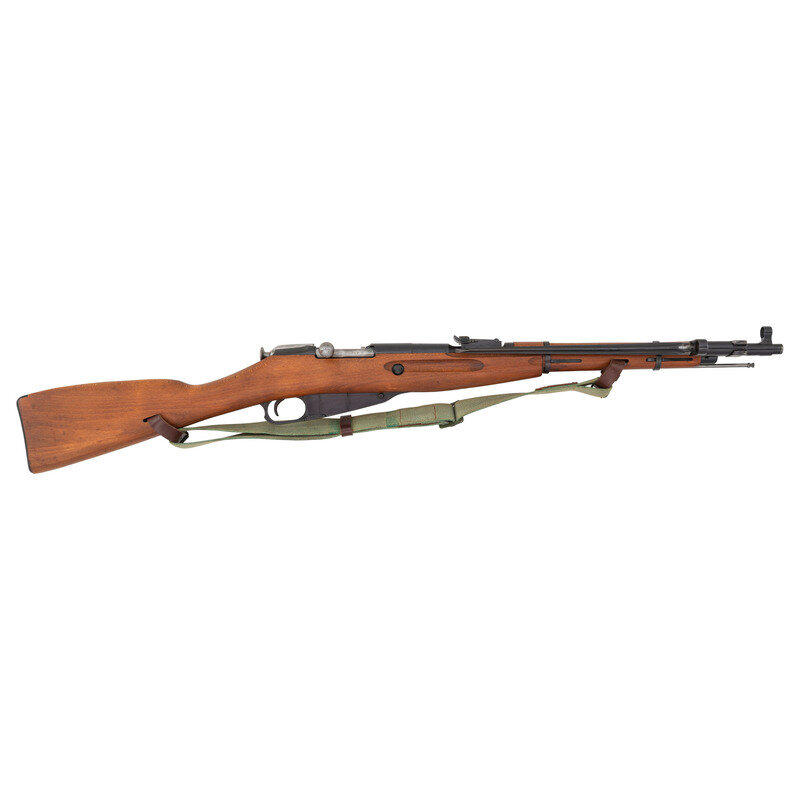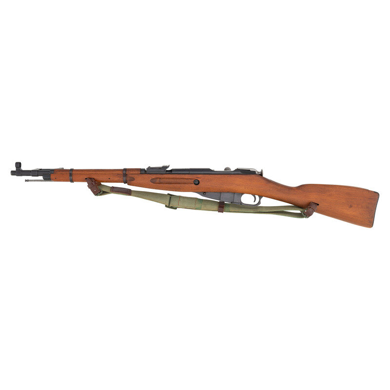 7.62x54mmR. 20.2" barrel length. SN: MO6880. Blued metal arsenal Refinish with polished bolt set in Birchwood straight wrist stock with standard adjustable tangent rear notch and post and globe front sights. Bolt action internal magazine fed repeating rifle charged by stripper clips. Item mounts a sidefolding cruciform spike bayonet, and comes with a canvas dog collar pattern sling, and cleaning rod. Barrel shank struck with the Soviet {Sickle and Hammer} acceptance stamp, a date of 1944, and the {Arrow in Triangle} stamp of Izhmash. Serial numbers are mixed.