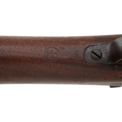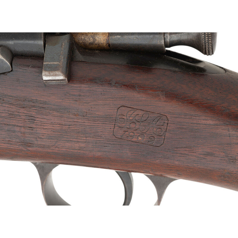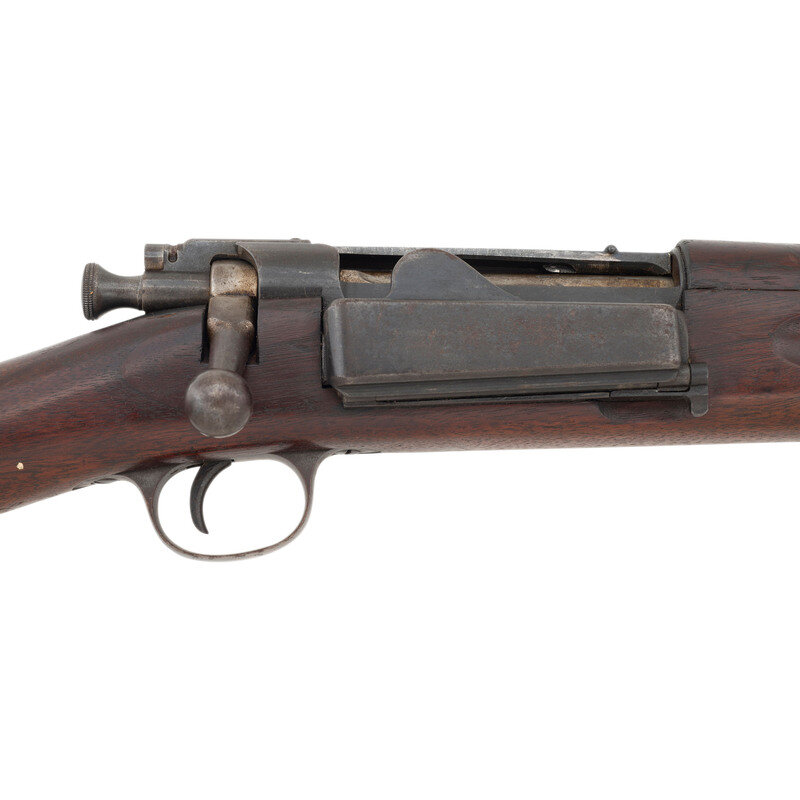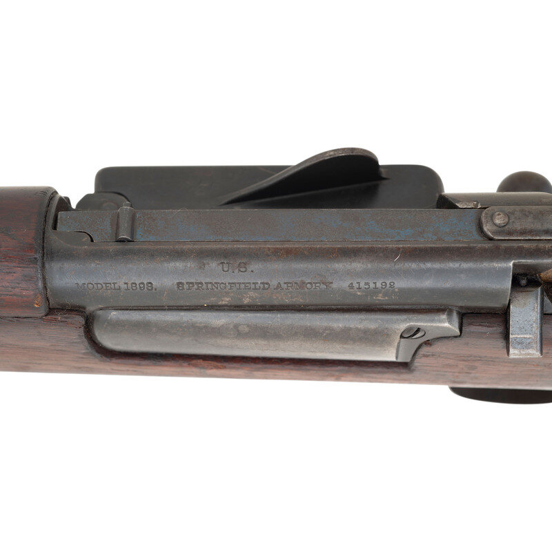 .30-40 Krag. 30" barrel length. SN: 415192. Blued metal finish with polished bolt set in straight wrist walnut stock with half length upper handguard. Bolt action internal magazine fed repeating rifle charged via trapdoor to right receiver. Item mounts adjustable 1901 pattern rear ladder sight paired with a pinned front blade. Receiver is struck with MODEL 1898. marking followed by U.S./SPRINGFIELD. Wrist displays a circle P marking while the left wrist retain a crisp JSA/1902 inspector's cartouche of Joseph Sumner Adams, who took over the role of inspecting new arms at Springfield Armory following the death of the ubiquitous Samuel W. Porter. Wrist further struck with the number 50.