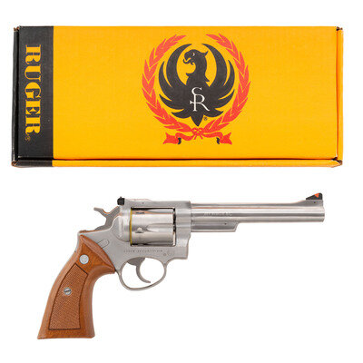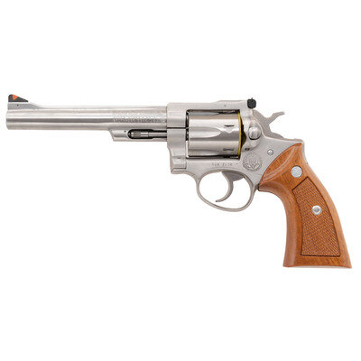 .357 Magnum. 6" barrel length. SN: 158-94858. Brushed stainless steel finish overall with oversize checkered walnut Ruger medallion grips with the left frame struck with the Ohio State Highway Patrol GOLDEN/ANNIVERSARY marking beside OSP 2230 issue mark. Double action six-shot hand ejector revolver mounting adjustable target rear notch and matted front ramp red plastic insert sights. Standard markings include four-line address and warning on the left barrel, caliber mark to the right. Frame is marked RUGER SECURITY-SIX followed by the {Ruger Logo}. Comes in its original cardboard box with the owner's manual.