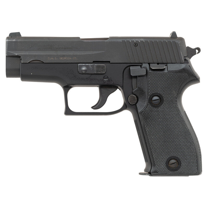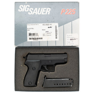 9mm Para. 3.9" barrel length. SN: M636412. Parkerized metal finish with black anodized frame mounting two-piece checkered black synthetic grips and two-dot sights. Short recoil operated DA/SA autoloading pistol fed by detachable single stack magazines. Standard markings include P6 model to right slide and SIG SAUER MADE IN GERMANY to the left. Importer marking on left slide reads C.A.I. GEORGIA VT. Right slide struck with the code NW followed by the date marking 06/96 indicating it was made in June of 1996. Standard German firing proofs appear on the slide, barrel, and frame. Comes in a Sig P225 marked box with three magazines, the factory test target, and the P6 owner's manual in German.