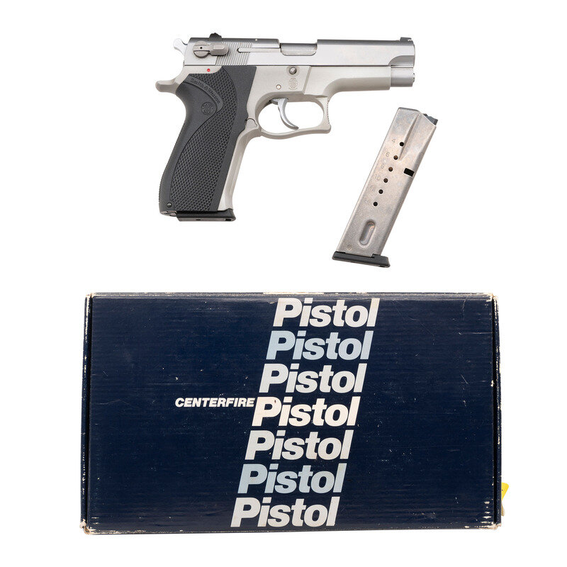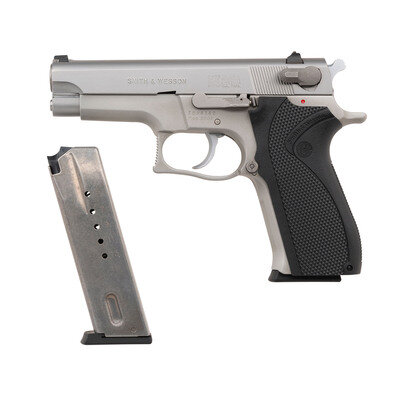 9mm Para. 4" barrel length. SN: TDH6152. Satin stainless steel finish to slide with matte finish to the alloy frame mounting checkered black synthetic one piece Smith & Wesson marked grips. Short recoil operated DA/SA autoloading pistol fed by detachable double stack magazines. Item mounts factory triple white dot sights. Markings include model mark to left frame, and four-line address on left slide. Item comes in a matching Smith & Wesson marked cardboard box with the owner's manual, two magazines, and a cleaning kit.