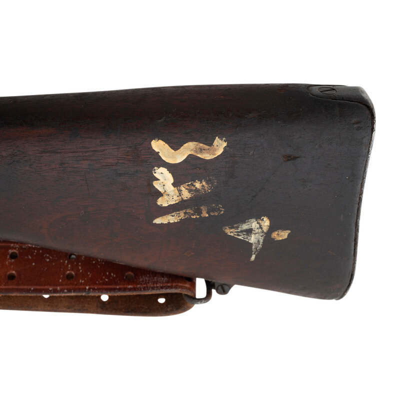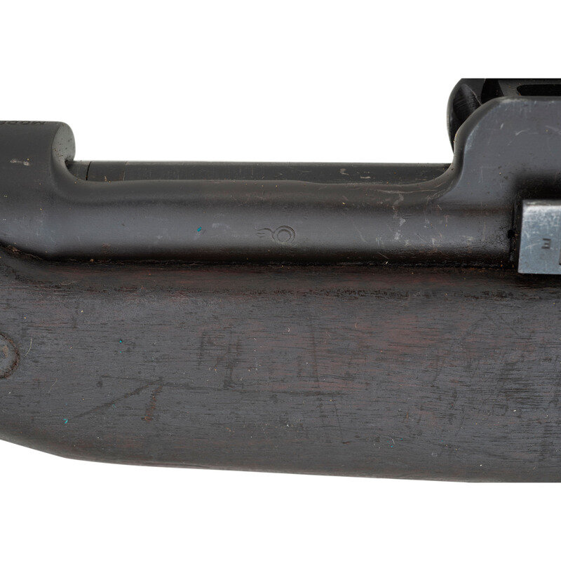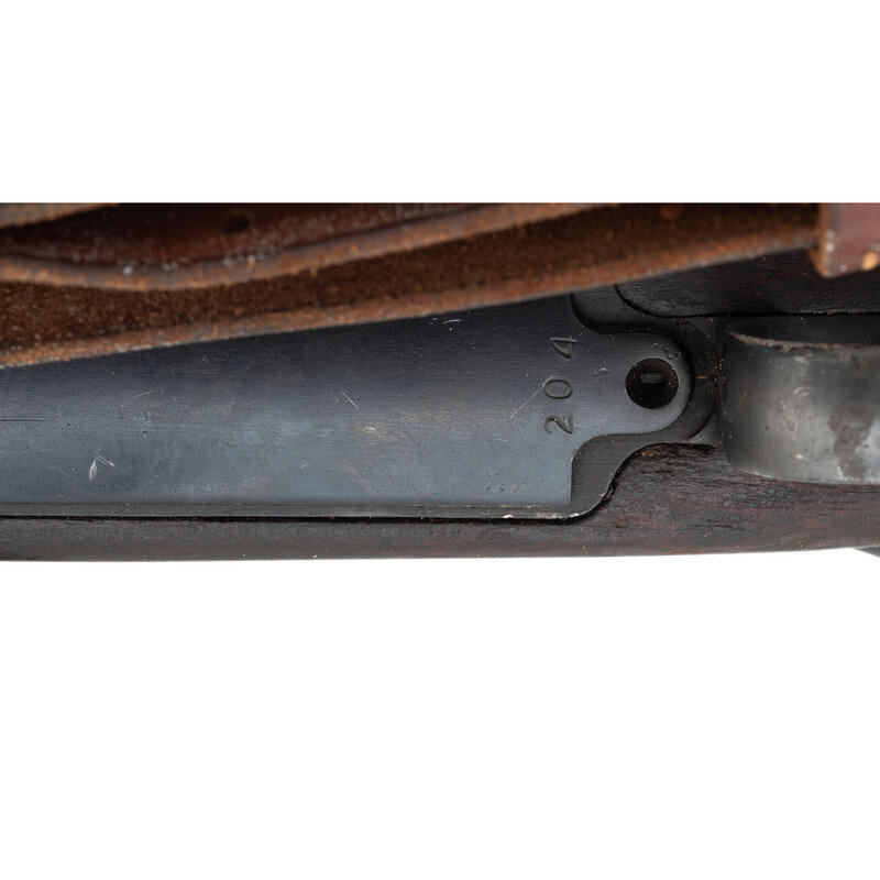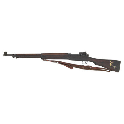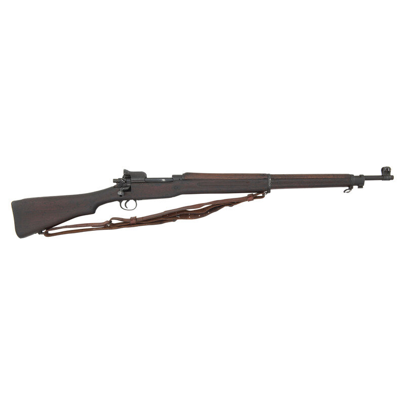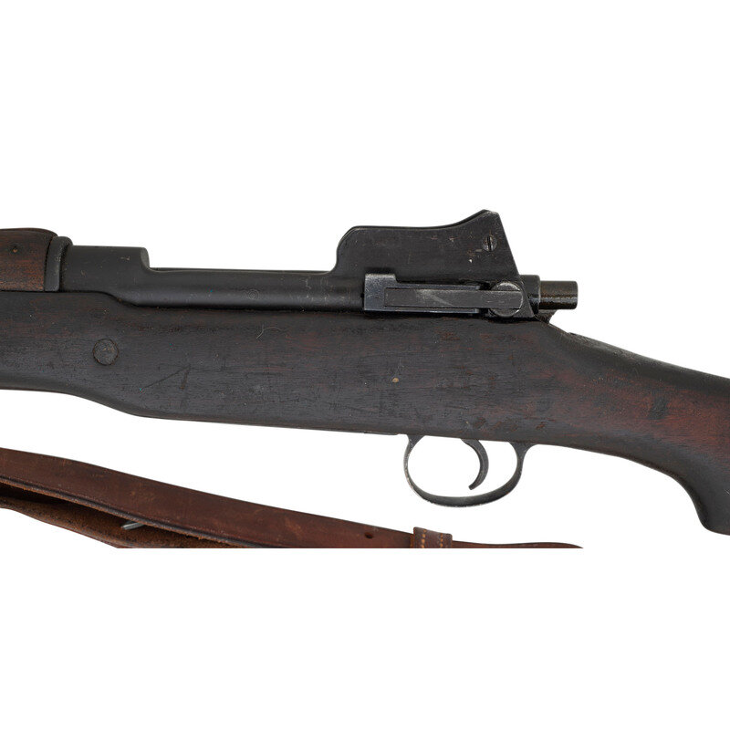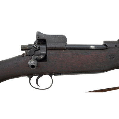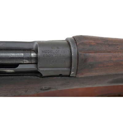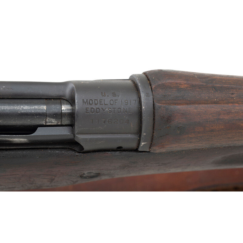 .30-06. 26" barrel length. SN: 1176204. Blued metal finish overall set in walnut semi-pistol grip stock mounting adjustable ladder rear aperture and front blade sights with protectors. Bolt action internal magazine fed repeating rifle charged with stripper clips. Receiver is marked U.S./MODEL OF 1917/EDDYSTONE followed by the serial number. Left receiver struck by {Ordnance Bomb} logo. Barrel is struck E/{Ordnance Bomb}/12-18, indicating it was made by Eddystone in December, 1918. Item shows scattered Eddystone E initials to major parts, {Ordnance Bomb} to the bolt handle, and a splice into the upper wrist. Mounts a M1905 pattern sling.