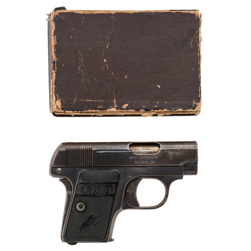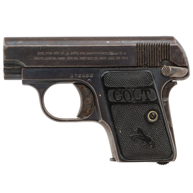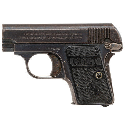 .25 ACP. 2" barrel length. SN: 176828. (Mfg ca 1918) Blued metal finish with polished barrel, case colored trigger and grip safety, and mounting checkered black synthetic COLT logo grips with {Rampant Colts}. Simple blowback operated single action autoloading pistol fed by detachable single stack magazines. Left slide is struck with two-line address and patent reading COLT'S PT. F.A. MFG. CO. HARTFORD. CT. U.S.A./PAT'D AUG. 25. 1896 APR. 20. 1897 DEC. 22. 1903 JAN. 25. 1910 with the {Rampant Colt} mark struck behind the cocking serrations. Right slide shows caliber and model marking COLT AUTOMATIC/CALIBRE 25. Comes in black cardboard box with COLT AUTOMATIC PISTOL/.25 end label. Interior of the box has glued in advert for Colt medallion grips. Included with box is the owner's manual.