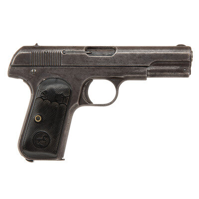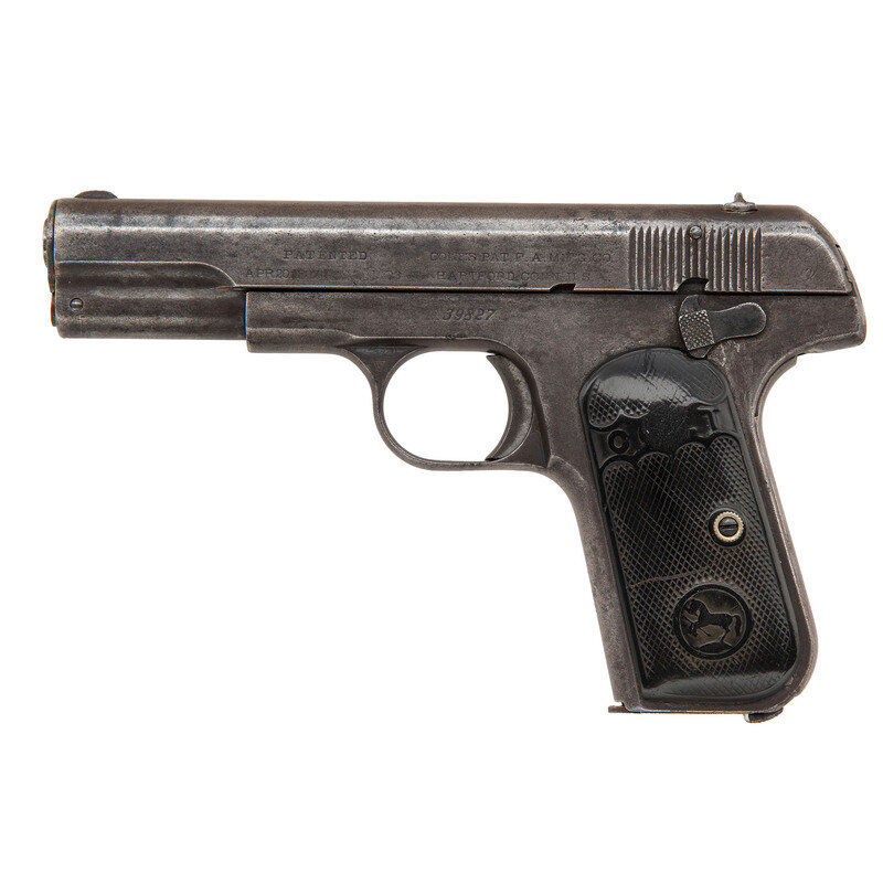 .32 ACP. 4" barrel length. SN: 39827. (Mfg ca 1906) Blued finish with standard low-profile front blade and rear notch sights mounting checkered black hardrubber grips with circled {Rampant Colt} logo. Simple blowback operated internal hammer fired autoloading pistol fed by detachable single stack magazines. Item features the four inch barrel, separate barrel bushing, and lacking magazine safety indicative of a Type I. Left slide struck PATENTED/APR. 20. 1897 with the latter date obliterated. Two-line address reads COLT'S PAT. F.A. MFG. CO./HARTFORD CONN. U.S.A. Right slide struck AUTOMATIC COLT/CALIBRE 32 RIMLESS SMOKELESS.
