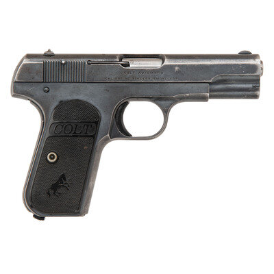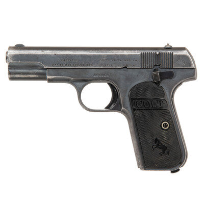 .32 ACP. 3.75" barrel length. SN: 268669. (Mfg ca 1918) Blued metal finish mounting non circled {Rampant Colt} logo hardrubber grips and standard rear notch and front blade sights. Simple blowback operated internal hammer fired autoloading pistol fed by detachable single stack magazines. Left slide marked PATENTED/APR. 20. 1897. DEC. 22. 1903 and COLT'S PT. F.A. MFG. CO./HARTFORD, CT. U.S.A. with the {Rampant Colt} logo behind cocking serrations. Standard model and caliber mark to right slide. Comes with no magazine.