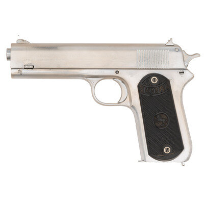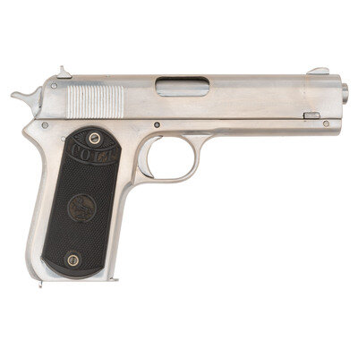 .38 ACP. 4.5" barrel length. SN: 22687. Nickel plated refinish overall mounting checkered black synthetic COLT logo grips with circled {Rampant Colts}. Short recoil operated single action autoloading pistol fed by detachable single stack magazines. Patent marks to slide read PATENTED/APR. 20. 1897. SEPT. 9. 1902. followed by two line address COLT'S PATENT FIRE ARMS MFG. CO./HARTFORD, CONN. U.S.A. with the circled {Rampant Colt} behind cocking serrations. Model mark to right slide reads AUTOMATIC COLT/CALIBRE 38 RIMLESS SMOKELESS. Standard Colt VP monogram proof to left trigger web. Magazine floorplate struck PKT./COLT/38 CAL.