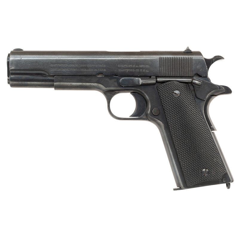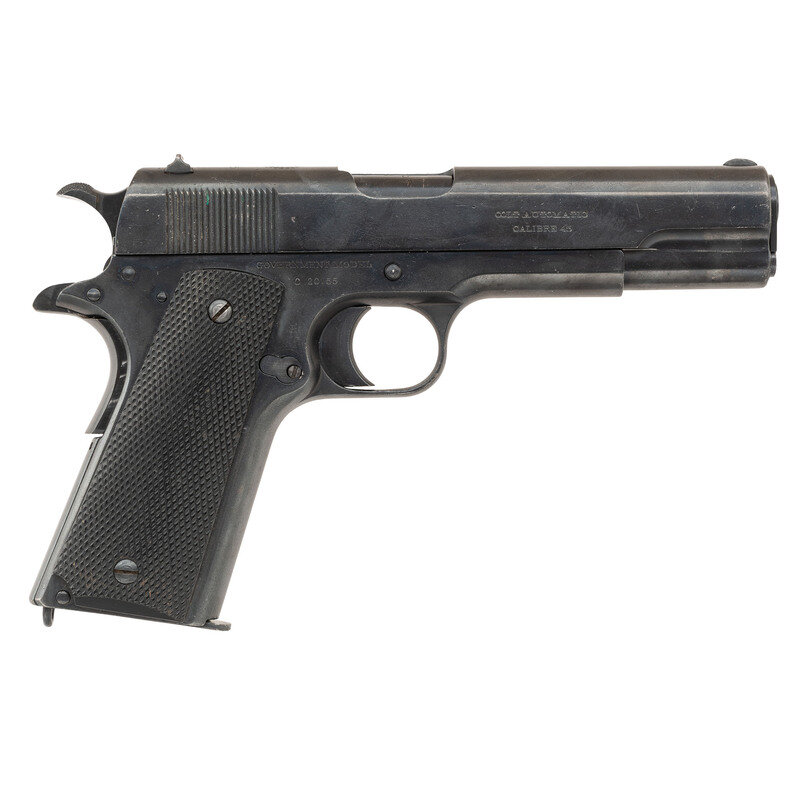 .45 ACP. 5" barrel length. SN: C20155. Blued military refinish overall mounting replacement checkered black synthetic grips and standard military pattern sights. Short recoil operated single action autoloading pistol fed by detachable single stack magazines and standard 1911 features including wide knurled hammer, flat lanyard loop mainspring housing, and frame without relief cut behind trigger. Top of the slide struck with the {Argentinian Liberty Cap Crest}. Further marks include two line patent to left slide reading PATENTED APR. 20. 1897. SEPT. 9. 1902/DEC. 19. 1905. FEB. 14. 1911. AUG. 19. 1913 followed by address reading COLT'S PT. F.A. MFG. CO./HARTFORD. CT. U.S.A. Rear slide struck with the {Rampant Colt} logo behind serrations. Right slide marked COLT AUTOMATIC/CALIBRE 45 forward of the ejection port. Right frame shows GOVERNMENT MODEL mark above the serial number. Interior grip panels show INDUSTRIA/ARGENTINA marks. Serial numbers match on slide, frame, barrel, and magazine floorplate.