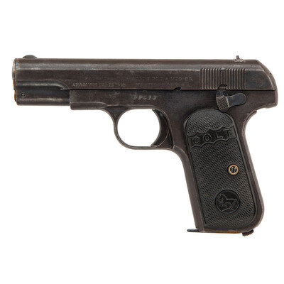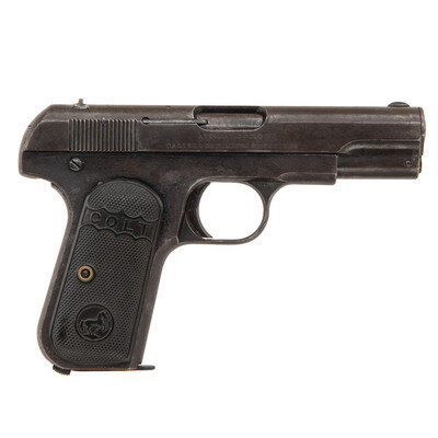 .32 ACP. 3.75" barrel length. 92419. (Mfc ca 1909) Blued metal finish with polished chamber mounting checkered {Rampant Colt} logo black hardrubber grips with standard low profile front blade and rear notch sights. Simple blowback operated concealed hammer autoloading pistol fed by detachable single stack magazines. Item features a separate barrel bushing, grip safety, thumb safety catch to the left frame, and no magazine safety. Left slide marked PATENTED/APR. 20. 1897 DEC. 22. 1903 followed by two-line address COLT'S PT. F.A. MFG. CO./HARTFORD, CT. U.S.A. Right slide marked AUTOMATIC COLT/CALIBRE 32 RIMLESS SMOKELESS. Standard Colt VP monogram firing proof to the triggerguard web.