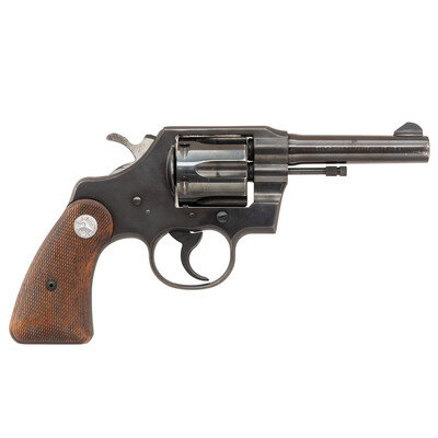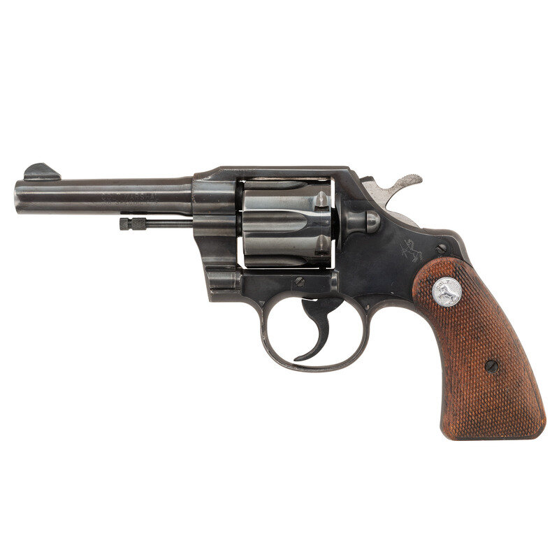 .38 Special. 4" barrel length. SN: 836451. (Mfg ca 1954) Blued metal finish with polished hammer flanks, matte edges, and mounting checkered walnut {Colt Medallion} grips. Double action hand ejector six-shot revolver mounting topstrap notch and matted front blade sights with rounded butt indicative of the Marshal frame. Left barrel marked COLT MARSHAL/.38 SPECIAL CTG. with the right showing single line address reading COLT'S MFG. CO. HARTFORD, CT. U.S.A. Sideplate is struck with the {Rampant Colt} logo. Standard VP monogram proof appears to the left forward web of the triggerguard. J initial to the left rear triggerguard web. Interior frame shows the M stamp, and two J initials. Colt's Marshal revolver comprised a Colt Official Police with a round butt frame. This model was offered from 1954 to 1956, during which only approximately 2,500 were manufactured, making it a rare variant of one of Colt's most successful designs.