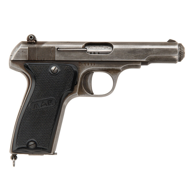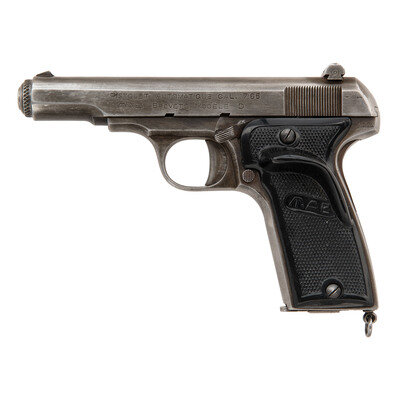 .32 ACP. 4" barrel length. SN: D1399. Blued metal finish mounting checkered black synthetic thumb rest grips with MAG logo. Simple blowback operated striker action autoloading pistol fed by detachable single stack magazines. Item mounts windage adjustable rear notch and fixed front blade sights. Standard make and model markings overall. Left rear frame struck with importer markings FED. ORG., INC./SO. EL MONTE, CA.