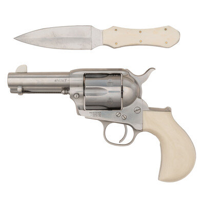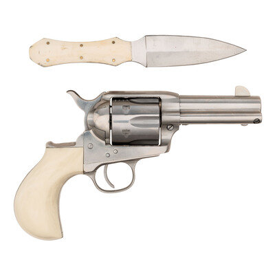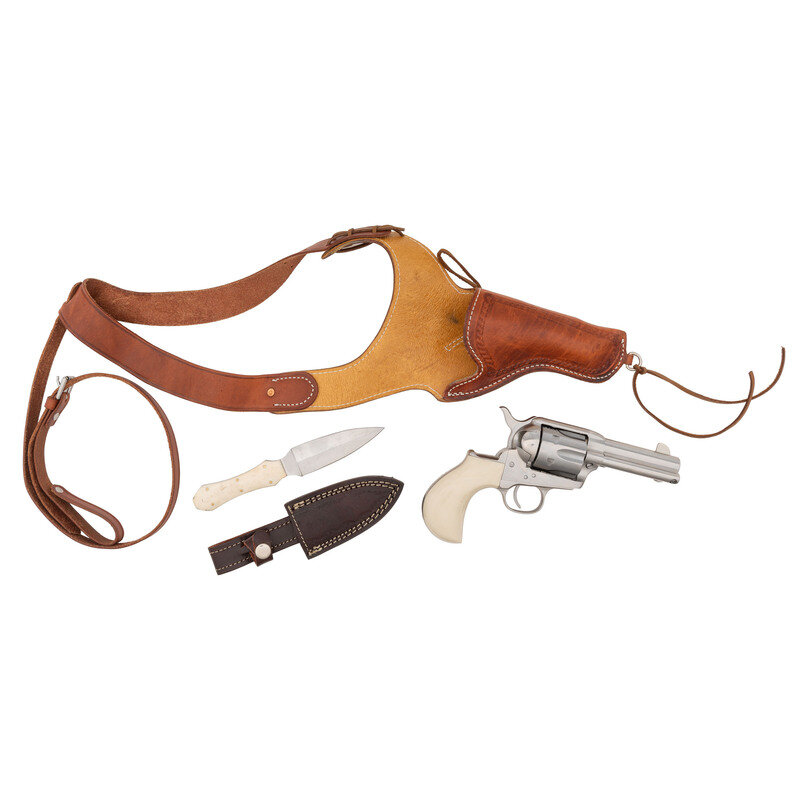 .45 Long Colt. 3.5" barrel length. SN: N14863. Brushed stainless steel finish overall mounting synthetic ivory colored grips with topstrap notch and front blade sights. Single action loading gate six-shot revolver with birdshead grips and backstrap engraved 'Doc' Holliday between light spiral embellishments. Item shows three patent in three lines mark to left frame with the top of the barrel marked CIMARRON F.A. CO. FREDERICKSBURG, TEXAS/MANUFACTURED by A. UBERTI, ITALY. Item shows standard Italian firing proof marks. Comes with a CIMARRON marked leather shoulder holster made by TEXAS JACK of Fredericksburg, Texas. Revolver is accompanied by a double edged stainless steel knife with coffin handle, brass fasteners, and synthetic ivory colored grip scales. Holster features an integrated sheath for the knife, and comes with an additional separate tooled leather sheath with belt loop.
