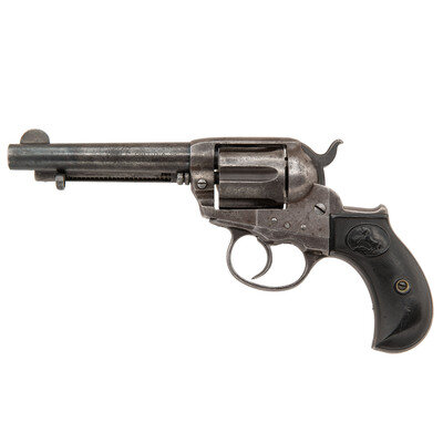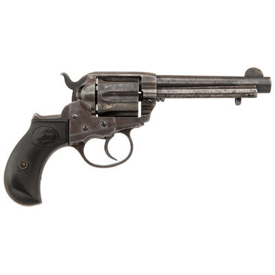 .38 Long Colt. 4.5" barrel length. SN: 161450. Blued and color case hardened finish mounting checkered hardrubber {Rampant Colt} logo grips. Double action six-shot loading gate revolver mounting half moon front blade and topstrap rear notch sights. Frame is struck with three-line patent mark followed by circled {Rampant Colt} logo. Further marks include two-line address to the top of the barrel with COLT. D.A. 38 on left. Gripstrap and cylinder serial numbers do not match frame.