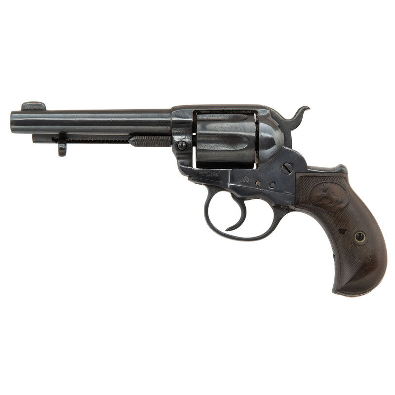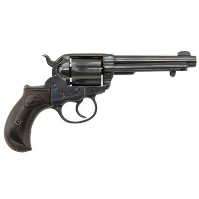 .38 Long Colt. 4.5" barrel length. SN: 135928. Blued metal refinish overall with long knurled cylinder pin and mounting checkered hardrubber rampant colt logo grips. Double action six-shot hand ejector revolver mounting cut-down half moon front blade and topstrap rear notch sights. Left frame struck with three-line patent mark followed by circled {Rampant Colt} logos. Barrel marks mostly obliterated in refinish with some faint traces of address to top barrel remaining. Serial numbers match on rear gripstrap and frame, but number on forward gripstrap has been obliterated.