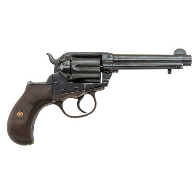 .38 Long Colt. 4.5" barrel length. SN: 154672. Blued metal refinish overall mounting replaced smooth walnut grips and standard half moon front blade and topstrap rear notch sights. Double action six-shot loading gate revolver featuring birdshead grips and spring loaded ejector rod. Left barrel struck with three-line patent mark with the Rampant Colt having been worn off during refinish. Two-line address to barrel and caliber marking are both weak.
