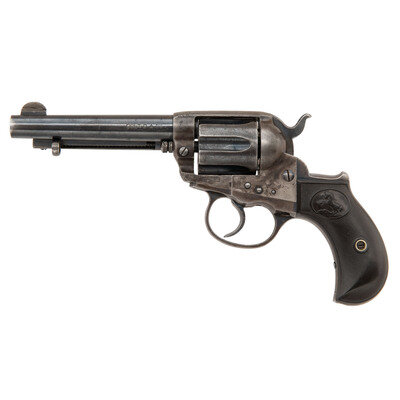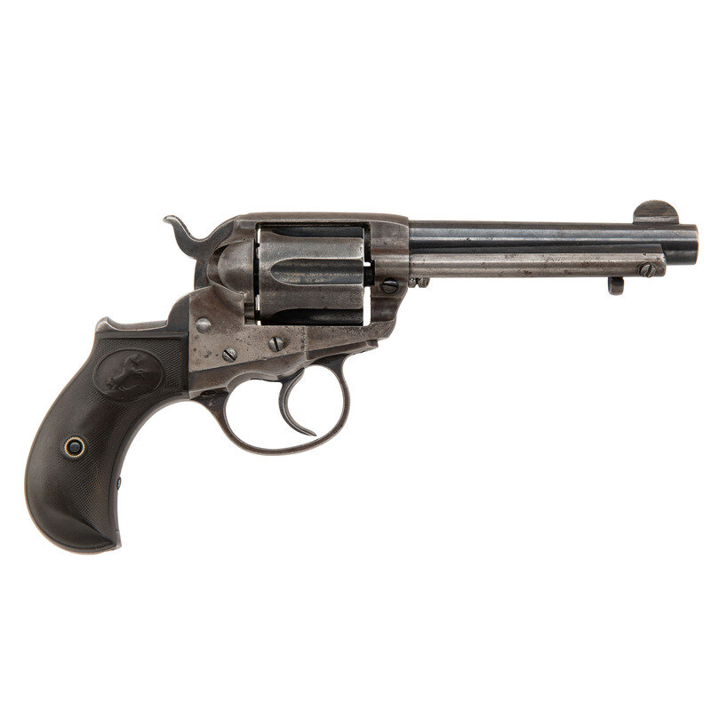 .38 Long Colt. 4.5" barrel length. SN: 127348. Color casehardened finish to frame mounting blued small parts, niter blued trigger and hammer, and checkered hardrubber grips with {Rampant Colt} logos. Double action six-shot loading gate revolver mounting half moon front blade and topstrap rear notch sights. Front blade sight has been filed on both sides to narrow it down. Markings include three-line address to left frame followed by circled {Rampant Colt} logo. Barrel marked with two-line address to top and COLT D.A. 38 to left flank.