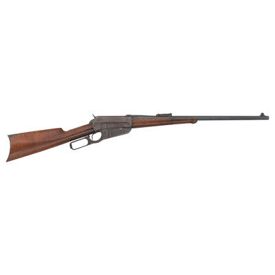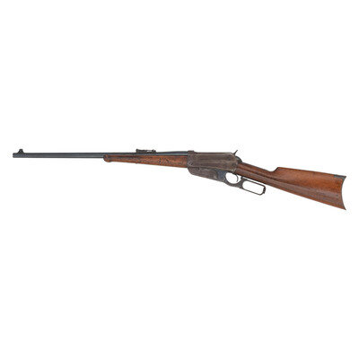 .30-06. 22" barrel length. SN: 84414. Blued metal finish with refinished barrel set in walnut straight wrist stock with Schnabel forend mounting adjustable ladder rear notch and pinned front bead sights. Lever action repeating rifle fed by an internal box magazine mounting crescent shaped butt. Tang is struck with model marking MODEL 1895/-WINCHESTER-/TRADE MARK REG. U.S. PAT. OFF. Winchester monogram proof remains visible on receiver, but has been worn off barrel due to refinish. Item shows standard two-line patent mark to left receiver, and two-line steel mark to barrel followed by caliber marking 30 GOV'T'06.