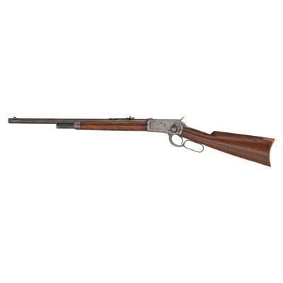 .38 WCF. 20" barrel length. SN: 220391. Blued metal finish with octagonal barrel set in walnut straight wrist stock with half length magazine tube and crescent shaped brass butt. Lever action repeating rifle fed by a tube magazine and mounting adjustable rear notch and front brass bead sights. Standard markings include MODEL 1892/-WINCHESTER-/PAT. OCT 14 1884. Barrel is struck with two line address and patent mark reading MANUFACTURED BY THE WINCHESTER REPEATING ARMS CO./-NEW HAVEN, CONN. U.S.A. PAT. OCT. 14. 1894-. Item further struck with 38 W.C.F. marking. Item features a saddle ring tot he left receiver. Forward sling stud has sheared off the nosecap.