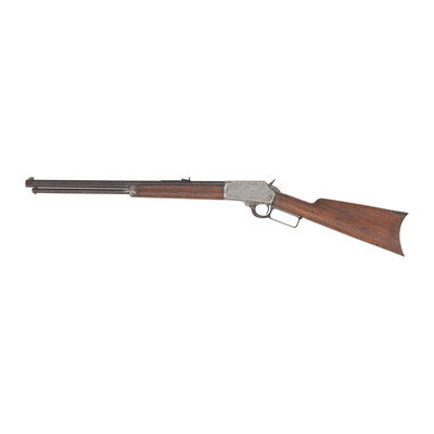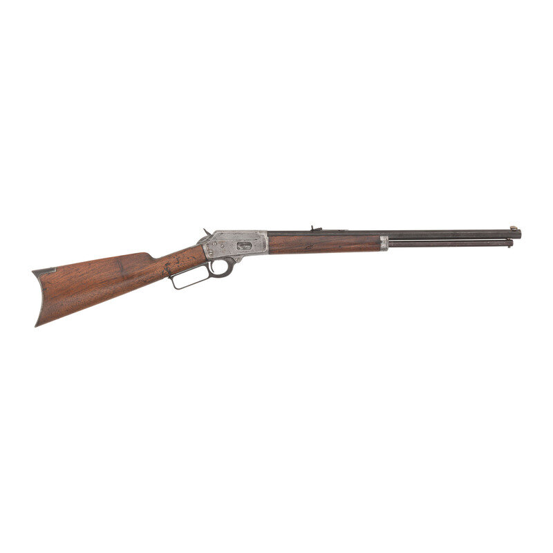 .25-20. 20" barrel length. SN: 201857. Blued metal finish with buffed bright receiver mounting walnut straight wrist stock and half length handguard with crescent buttplate and steel nosecap. Lever action repeating rifle fed by a full length tube magazine and featuring an octagonal barrel. Sights consist of adjustable semi-buckhorn rear notch and front blade. Item shows standard markings including MARLIN SAFETY to the top of the receiver and MODEL/1894 to the tang. Barrel is struck by two-line address and patent mark with three patent dates ranging from 1887 to 1893.