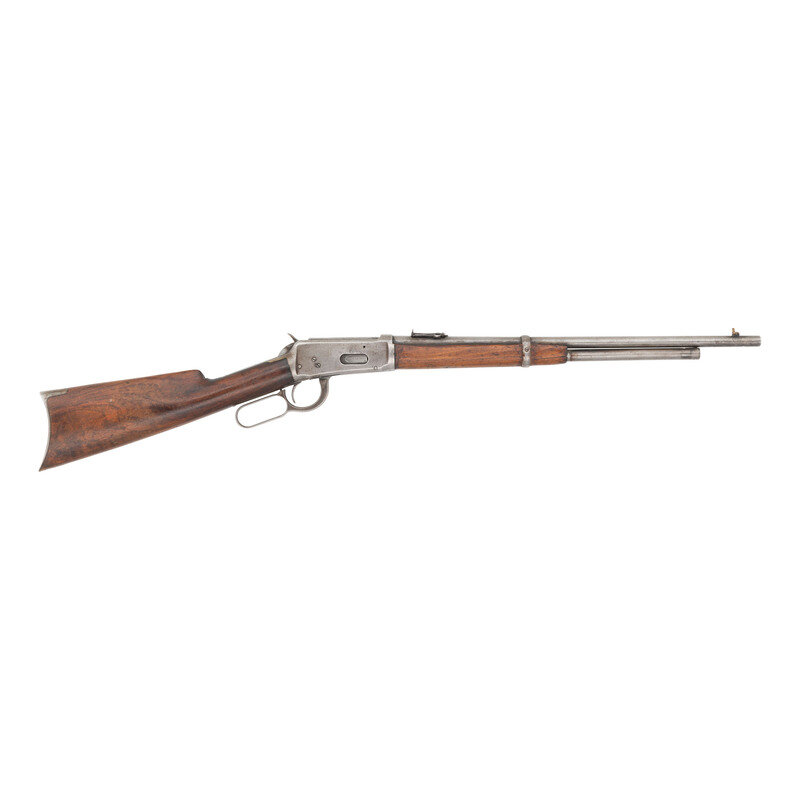 .30-30. 20" barrel length. SN: 381343. Buffed metal finish mounting straight wrist walnut stock with crescent butt. Lever action repeating rifle with round barrel mounting adjustable ladder rear and replaced pinned brass blade front sights. Magazine tube is missing the forward band, and the rear sight is missing the slider. Standard markings include MODEL 1894/-WINCHESTER-/TRADE MARK to the tang, and .30 W.C.F. caliber marking to the upper rear barrel. Middle barrel struck with two-line address and patent markings. Saddle ring to the left receiver.