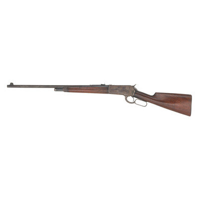 .33 WCF. 24" round barrel. SN: 147377 (mfg. ca. 1909). Blued finish, smooth straight gripped walnut stock with shotgun butt and checkered steel buttplate. Lever action repeating rifle with half-magazine, elevation adjustable semi-buckhorn rear sight and Layman blade front sight. Winchester proofs on barrel and receiver, standard Winchester barrel markings.